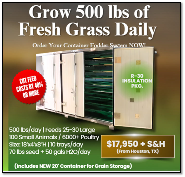 A high-capacity container or stand alone fodder system can produce exceptional yields and quality while reducing your feed costs. This can provide animals daily with the most nutritious 'live' fresh forage available. Additional benefits include: lessen impact of droughts on forage production - reduce methane emissions (cattle) - control and stabilize feeding costs - reduce the need for additional land production - create a more nutritious protein for human consumption. This ensures that animals live a more humane life while providing for mankind.