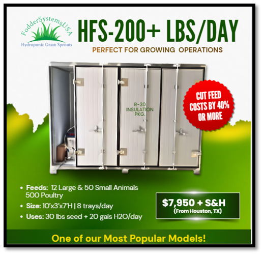 By using only High Quality-High Germination seed of 95% or better, an efficient Fodder System should produce (7) Tons of highly nutritious Fodder for every (1) Ton of Dry Seed.